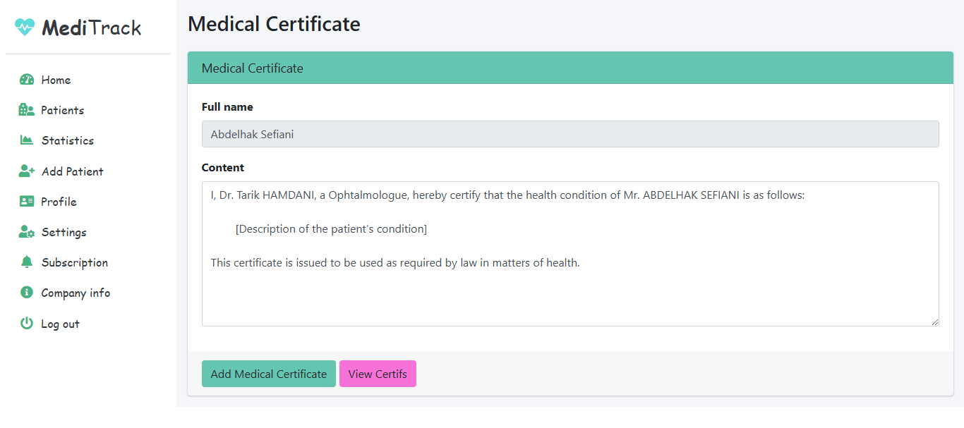 - Add Medical Certificate: Generate a certificate for the patient.