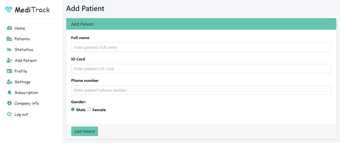 - Fields to Fill: Patient Name, ID Card, Phone Number, and Gender.