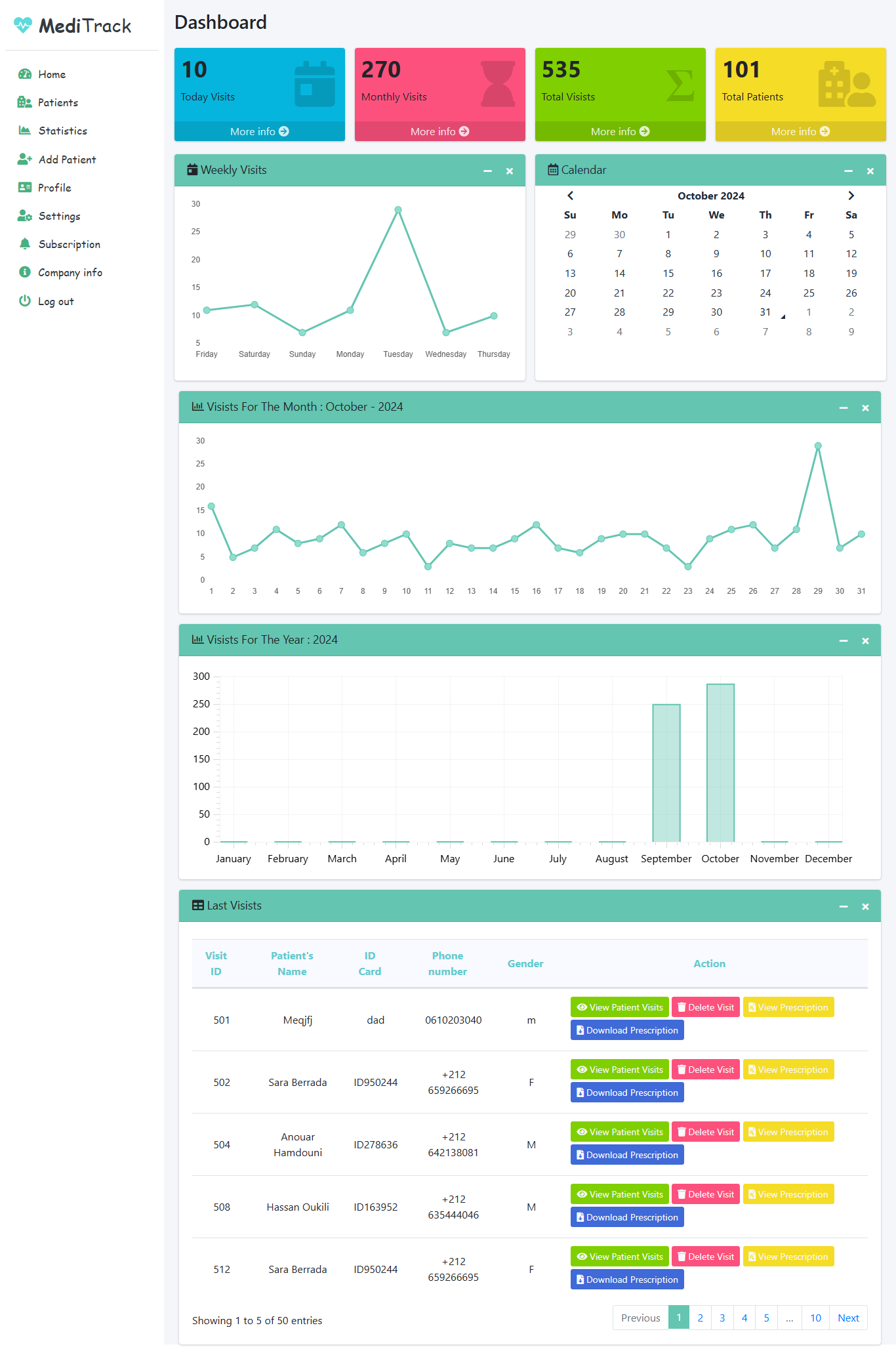 - Statistics: View the number of (today / monthly / total) visits, and total patients.