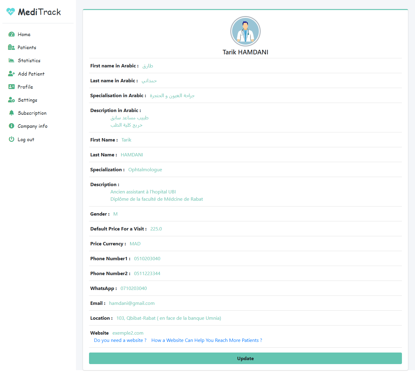 - Modifiable Information: First Name, Last Name, Specialization, Default Price for Visits, Phone Number, Email, Location, etc.