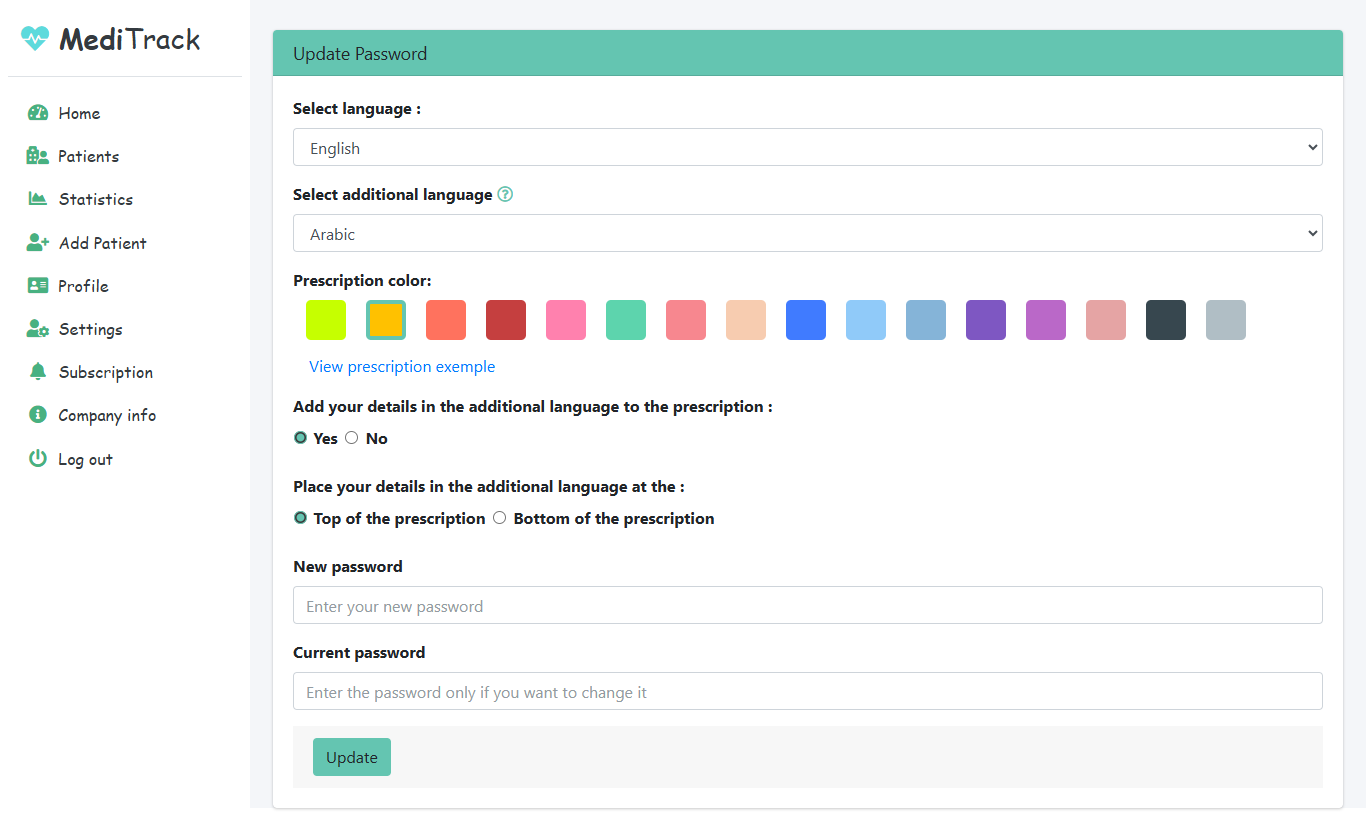 - Set an additional language, allowing you to write your prescription description in two languages: the primary language and an additional language