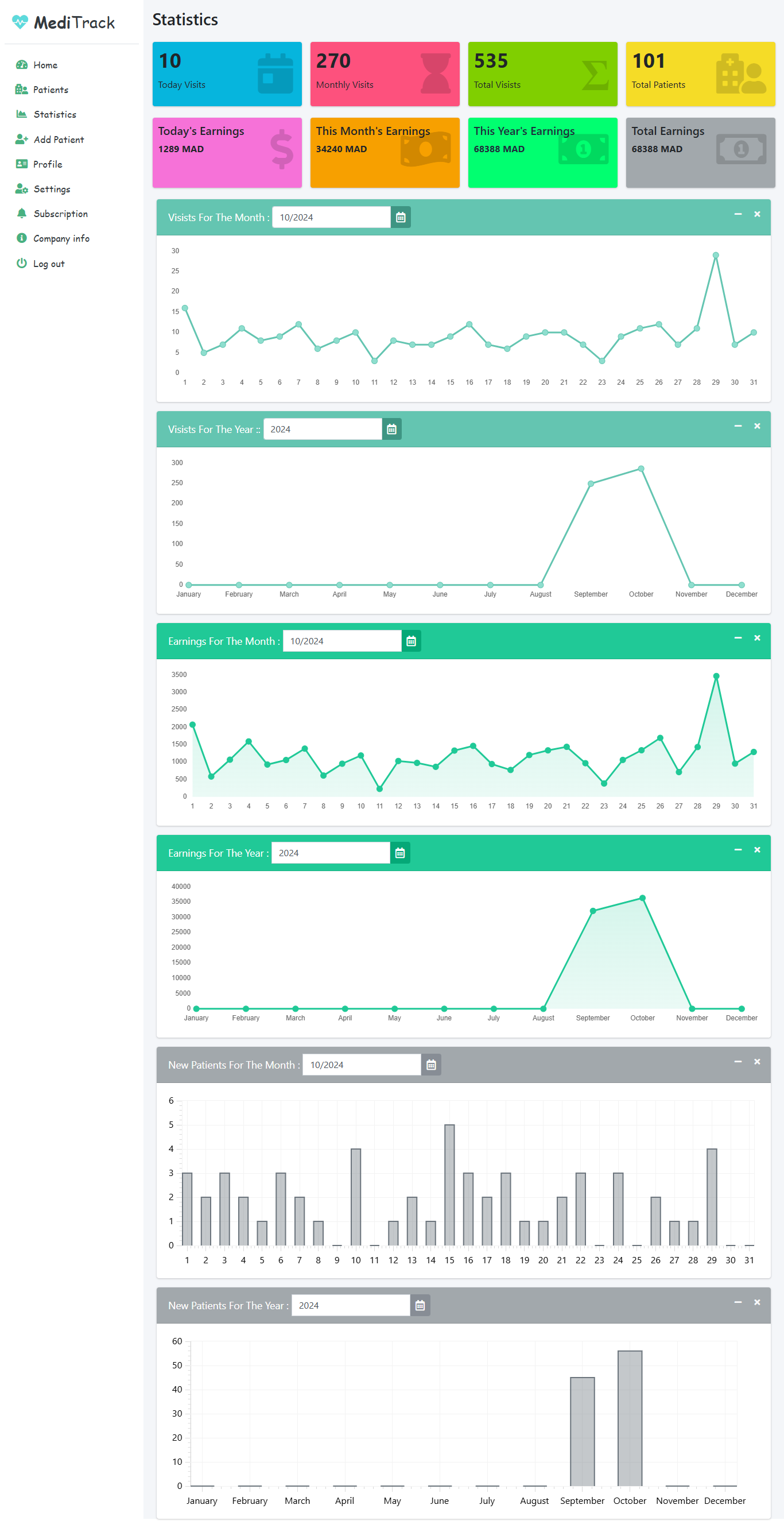 - Dynamic Graphs: Obtain a visual overview of visits, revenue and new patients for a specific period (month or year).