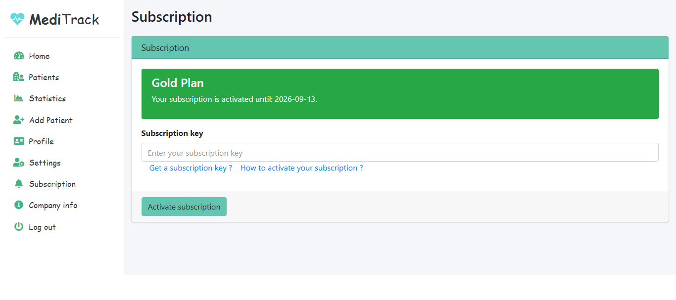- Input Subscription Key: Enter your subscription key to validate and activate your account. Keys must be purchased from the MediTrack main site.