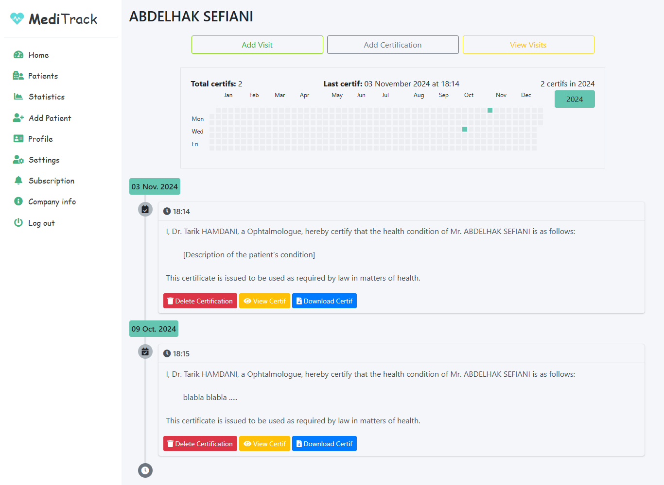 - View Medical Certificates: Display all certificates issued for the patient.